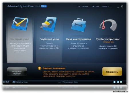 Advanced SystemCare - программа, включающая в себя множество модулей для оптимизации, настройки и повышения производительности компьютеров, находящихся под управлением операционными системами Windows 2000/XP/Vista/7/8. Благодаря возможностям программы вы сможете очистить ПК от шпионского и рекламного ПО, обнаружить и заранее устранить возможные угрозы и бреши в системе безопасности ОС, исправить ошибки в системном реестре, очистить временные и ненужные файлы, управлять списками автозагрузок, оптимизировать работу систем. Благодаря возможностям Advanced SystemCare вы сможете очистить ПК от шпионского и рекламного ПО, обнаружить и заранее устранить возможные угрозы и бреши в системе безопасности ОС, исправить ошибки в системном реестре, очистить временные и ненужные файлы, управлять списками автозагрузок, оптимизировать работу системы.
