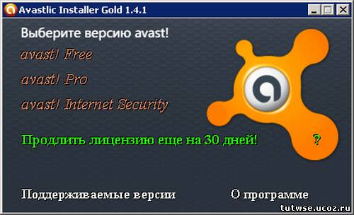 Avastlic Installer Gold - программа для автоматической установки файлов лицензий для avast! PRO, Internet Security 5, 6, 7. Обеспечит пользователей avast! Pro, Internet Security всегда свежими файлами лицензий (license.avastlic) и установит одним нажатием кнопки. (с этой программой можно забыть про "сообщение о пиратке". Продлевает лицензию avast! вставляя официальные 30-дневные файлы лицензий (которые не банят), тем самым у вас получается вечный триал!