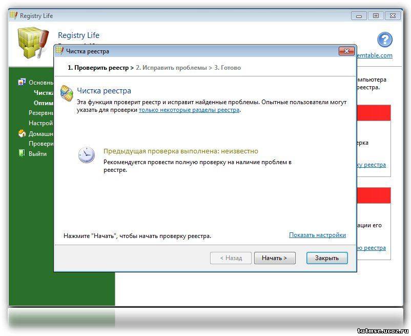 Для ликвидации первой причины замедления компьютера Registry Life предлагает удобный инструмент для очистки и исправления реестра. С его помощью можно провести проверку реестра на наличие более 10 категорий различных проблем. Одновременно с этим программа проведет удаление информационного мусора из реестра.